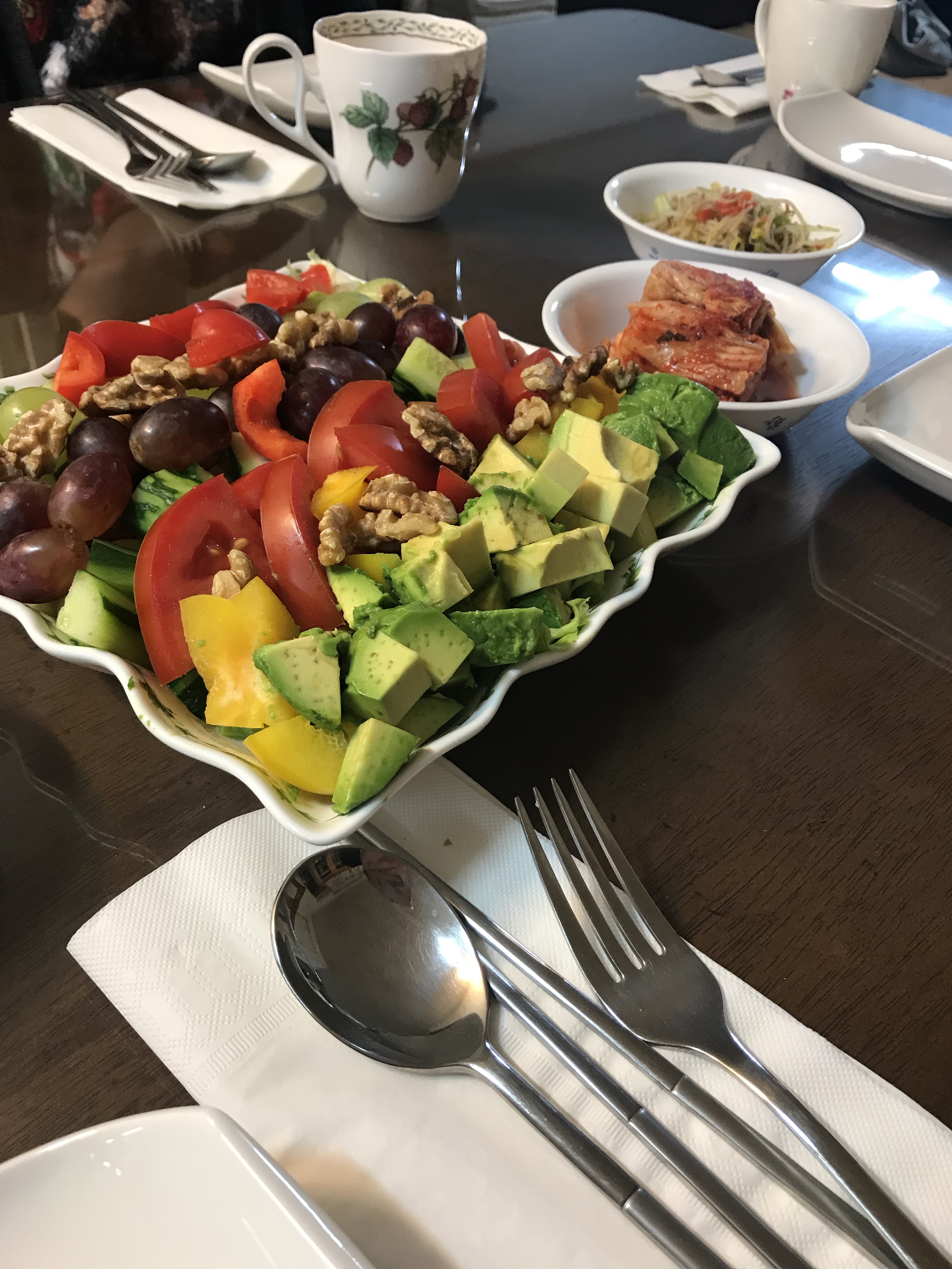 Thanksgiving passed, and my Korean teacher invited us over her house for a traditional meal. It was easily the best meal I have had here so far. We had a fruit salad with a bear (배) dressing, seafood japchae (잡채), beef bulgogi (불고기), tofu (두부), kimchi (김치), and soup (국), with a pear and persimmon (감) for dessert. It was extremely kind of her to invite us to her home for a family meal, which was exactly what I had missed with not celebrating Thanksgiving.
